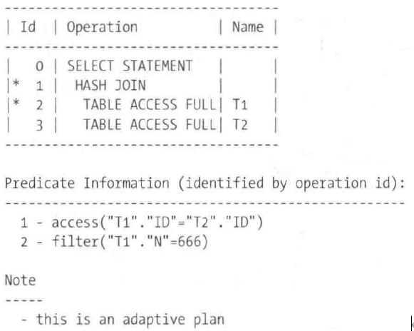 简单来说,这是查询优化器在不考虑自适应执行计划时会选择的执行计划。如果想看见包含子计划的完整执行计划,必须在使用dbms_xplan包时指定adaptive修饰符。在这种情况下,有三个额外的操作会在该执行计划中显示: