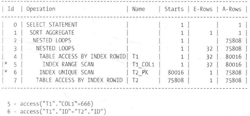 查询优化器为操作4估算的是,只返回32行数据而不是80016行。更糟糕的是,操作2和操作3是关联组合操作。这意味着操作6和操作7,实际上被分别执行了80016和75808次,而不是估算的只执行32次。这是通过Starts列的值确定的。一定要注意操作6和操作7的估算是正确的。实际上,在作比较之前,实际的基数(A-Rows)必须除以执行的数量(Starts):