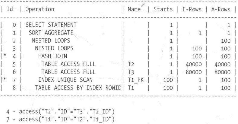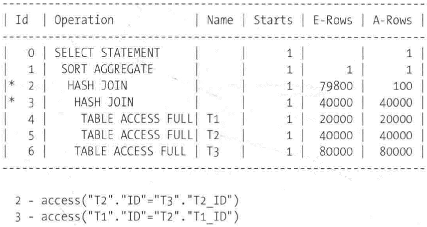 遇到这样的问题时,你可能会束手无策。事实上,没有用来描述两张表之间的关系的对象统计信息。修正这种问题的一个可行的办法是使用SQL概要。在本例中应用一个SQL概要会给出如下的执行计划。(我在第11章中介绍了什么是SQL概要以及它是如何工作的。)目前,重要的是要意识到有解决方案存在。要注意,不仅是联接顺序改变了(t2>t3>t1),连访问t1表的方式也不同了:
