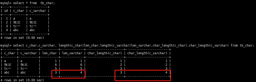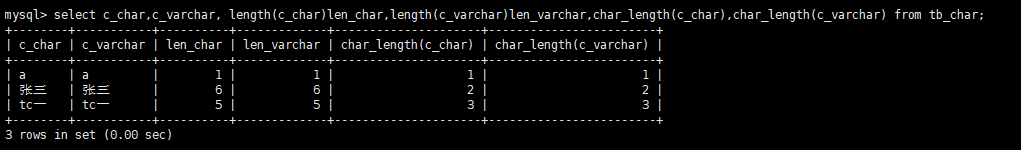 mysql> select c_char,c_varchar, length(c_char)len_char,length(c_varchar)len_varchar,char_length(c_char),char_length(c_varchar) from tb_char;+--------+-----------+----------+-------------+---------------------+------------------------+| c_char | c_varchar | len_char | len_varchar | char_length(c_char) | char_length(c_varchar) |+--------+-----------+----------+-------------+---------------------+------------------------+| a | a | 1 | 1 | 1 | 1 || 张三 | 张三 | 6 | 6 | 2 | 2 || tc一 | tc一 | 5 | 5 | 3 | 3 |+--------+-----------+----------+-------------+---------------------+------------------------+3 rows in set (0.00 sec)