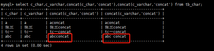 mysql> select c_char,c_varchar,concat(c_char,'concat'),concat(c_varchar,'concat') from tb_char;+--------+-----------+-------------------------+----------------------------+| c_char | c_varchar | concat(c_char,'concat') | concat(c_varchar,'concat') |+--------+-----------+-------------------------+----------------------------+| a | a | aconcat | aconcat || 张三 | 张三 | 张三concat | 张三concat || tc一 | tc一 | tc一concat | tc一concat || abc | abc | abcconcat | abc concat |+--------+-----------+-------------------------+----------------------------+