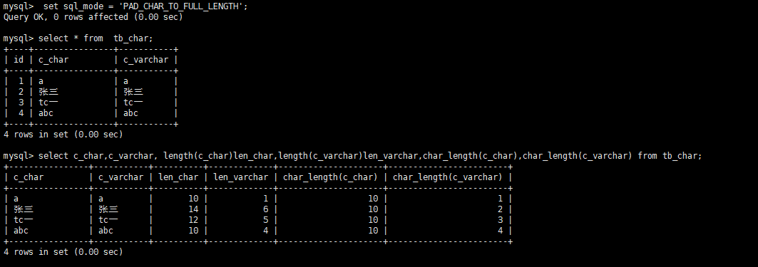 mysql> set sql_mode = 'PAD_CHAR_TO_FULL_LENGTH';Query OK, 0 rows affected (0.00 sec)mysql> select * from tb_char;+----+----------------+-----------+| id | c_char | c_varchar |+----+----------------+-----------+| 1 | a | a || 2 | 张三 | 张三 || 3 | tc一 | tc一 || 4 | abc | abc |+----+----------------+-----------+4 rows in set (0.00 sec)mysql> select c_char,c_varchar, length(c_char)len_char,length(c_varchar)len_varchar,char_length(c_char),char_length(c_varchar) from tb_char;+----------------+-----------+----------+-------------+---------------------+------------------------+| c_char | c_varchar | len_char | len_varchar | char_length(c_char) | char_length(c_varchar) |+----------------+-----------+----------+-------------+---------------------+------------------------+| a | a | 10 | 1 | 10 | 1 || 张三 | 张三 | 14 | 6 | 10 | 2 || tc一 | tc一 | 12 | 5 | 10 | 3 || abc | abc | 10 | 4 | 10 | 4 |+----------------+-----------+----------+-------------+---------------------+------------------------+4 rows in set (0.00 sec)