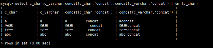 mysql> select c_char,c_varchar,concat(c_char,'concat'),concat(c_varchar,'concat') from tb_char;+----------------+-----------+-------------------------+----------------------------+| c_char | c_varchar | concat(c_char,'concat') | concat(c_varchar,'concat') |+----------------+-----------+-------------------------+----------------------------+| a | a | a concat | aconcat || 张三 | 张三 | 张三 concat | 张三concat || tc一 | tc一 | tc一 concat | tc一concat || abc | abc | abc concat | abc concat |+----------------+-----------+-------------------------+----------------------------+4 rows in set (0.00 sec)