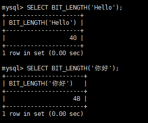 SELECT BIT_LENGTH('Hello'); -- 返回 40(5个英文字符,每个字符8位)SELECT BIT_LENGTH('你好'); -- 返回 48(2个中文字符,每个字符24位)