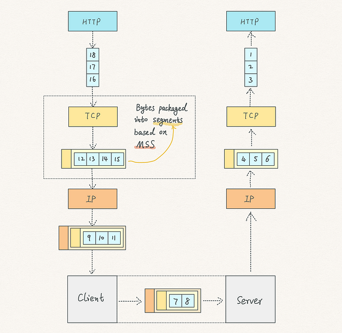 当字节16-18尚未到达TCP层时,字节12-15通过了它。TCP将它们打包成一个段,并附加了一个TCP头,标记在黄色区域。