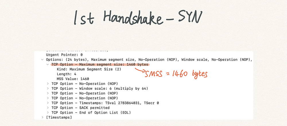 在SYN消息中,客户端建议MSS为1460字节。这被称为发送方最大段大小(SMSS)。