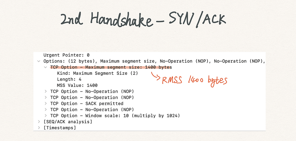 在服务器的响应中,它建议段的大小不超过1400字节。由于大小来自服务器,因此被称为接收方最大段大小(RMSS)。