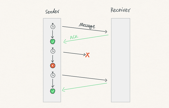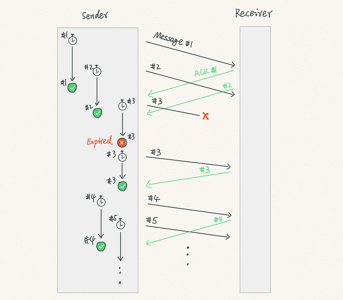 1.首先,发送方在发送消息后维护一个计时器。2.在时间过期之前收到第一个ACK。然后,计时器被重置以等待第二条消息,然后重复此过程。3.第二个计时器过期,没有收到ACK。重传开始。