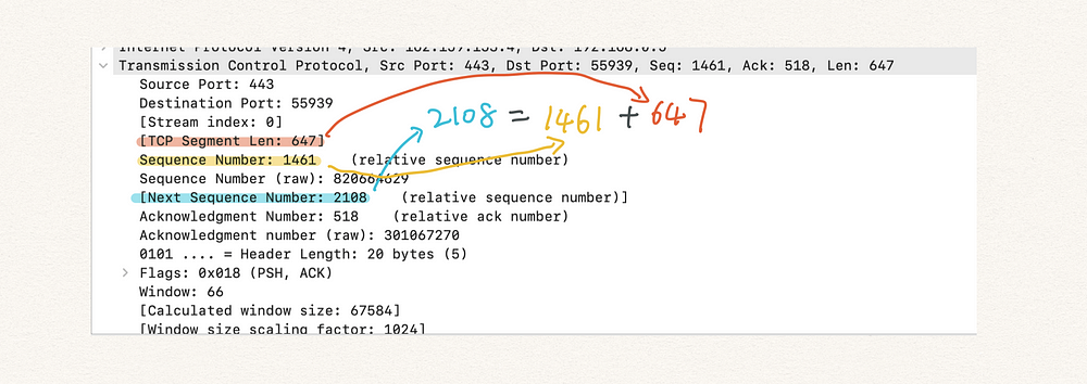 •此TCP段的长度为647字节。•在此消息之前,发送方已经发送了1461字节。•发送方将从2108开始发送更多字节。