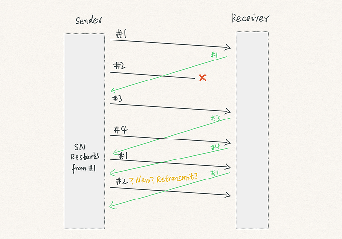 1.在过程中,第2个字节(标记为#2)丢失。根据设计,#2将在以后的时间重新传输。2.我们继续发送更多字节,直到序列号从#1开始。此时,重新传输的#2被发送。3.接收方不知道这是旧的#2还是新的#2。这可能会搞乱事情。