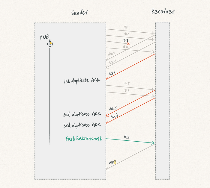 1.在第一个2个段的传输之后,段3丢失。2.在接收到段4时,接收方根据规则发送ACK3,而不是ACK4。这是第一个重复的乱序ACK。3.再次,在接收到段5时,服务器仍然期望重新传输段3。因此,第二个重复的ACK3被发送。4.然后,第三个重复的ACK3被发送。5.在这一刻,发送方进入快速重传并重新传输段3。6.在接收到丢失的段后,接收方的ACK按顺序返回,并期望在即将到来的消息中接收段7。