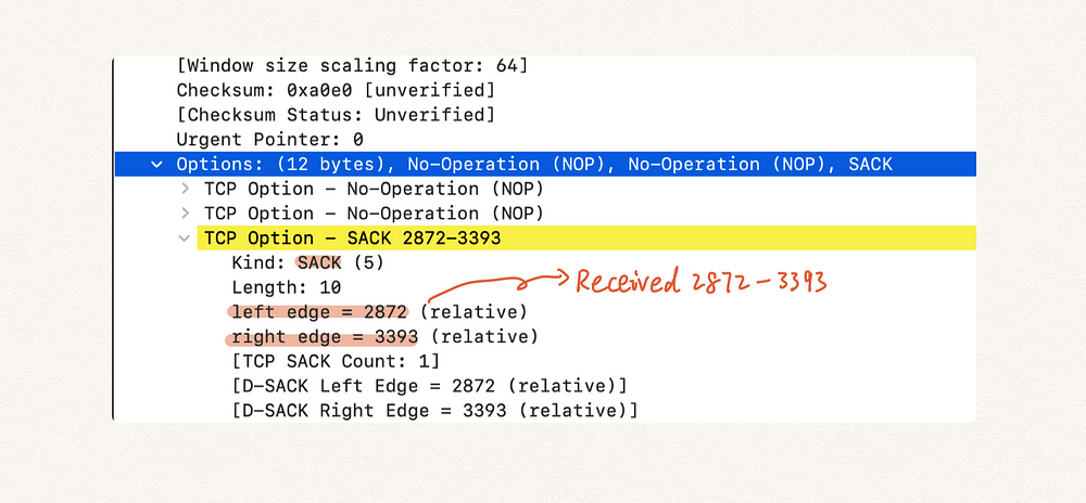 这是SACK的示例,表示已接收的数据范围从2872到3393。