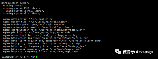 [root@hd03 nginx-1.20.2]# ./configure --user=nginx --group=nginx --prefix=/usr/local/nginx --sbin-path=/usr/local/nginx/bin/nginx --conf-path=/usr/local/nginx/conf/nginx.conf --pid-path=/usr/local/nginx/logs/nginx.pid --lock-path=/usr/local/nginx/run/nginx.lock --error-log-path=/usr/local/nginx/logs/error.log --http-log-path=/usr/local/nginx/logs/access.log --http-client-body-temp-path=/var/cache/client_temp --http-proxy-temp-path=/var/cache/proxy_temp --http-fastcgi-temp-path=/var/cache/fastcgi_temp --http-uwsgi-temp-path=/var/cache/uwsgi_temp --http-scgi-temp-path=/var/cache/scgi_temp --with-http_v2_module --with-http_ssl_module --with-http_realip_module --with-http_addition_module --with-http_sub_module --with-http_dav_module --with-http_flv_module --with-http_mp4_module --with-http_gunzip_module --with-http_gzip_static_module --with-http_random_index_module --with-http_secure_link_module --with-http_stub_status_module --with-http_auth_request_module --with-mail --with-mail_ssl_module --with-file-aio --with-http_v2_module --with-threads --with-stream --with-stream_ssl_module --without-mail_pop3_module --without-mail_imap_module --without-mail_smtp_module --add-module=/usr/local/ngx_devel_kit-0.3.0 --add-module=/usr/local/lua-nginx-module-0.10.13