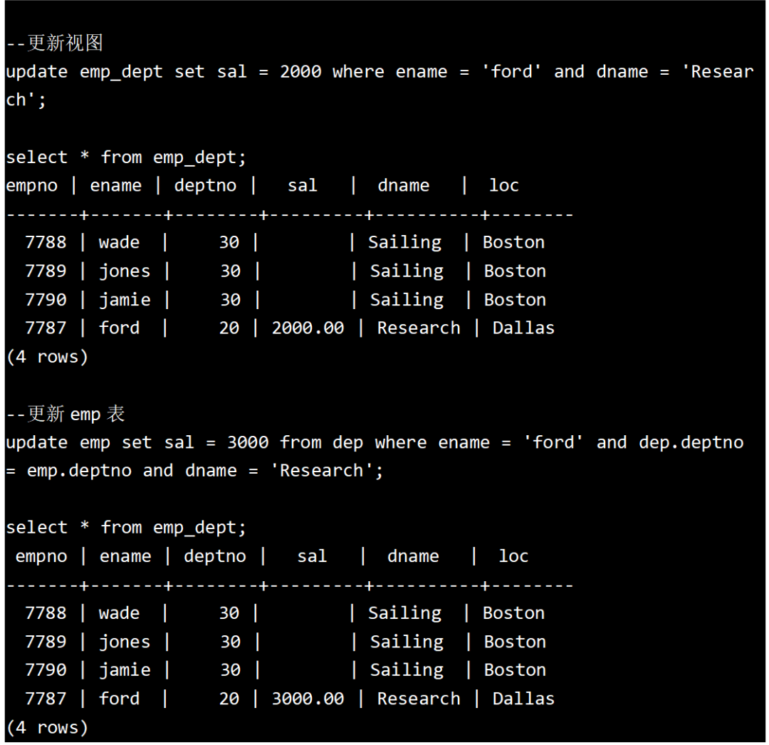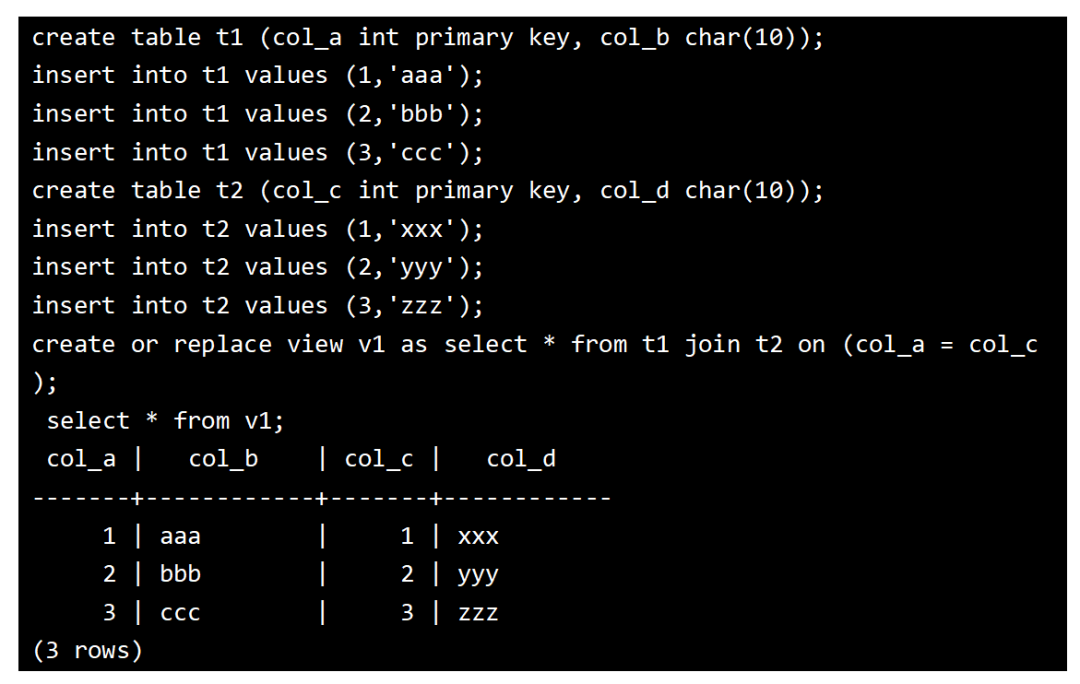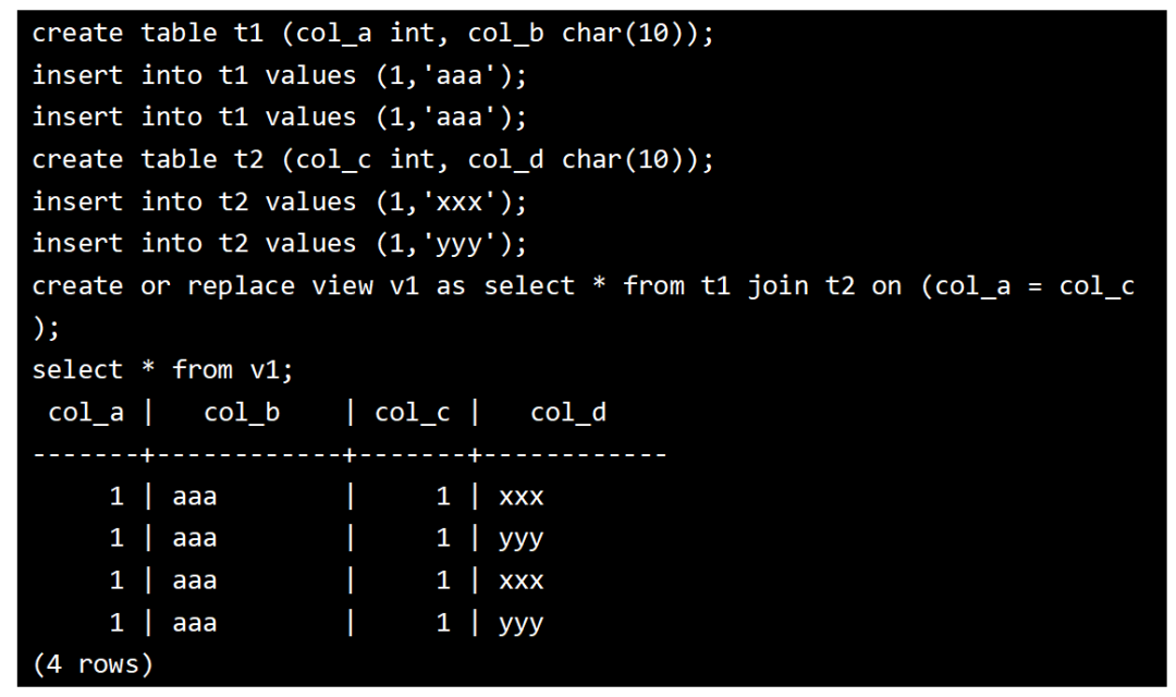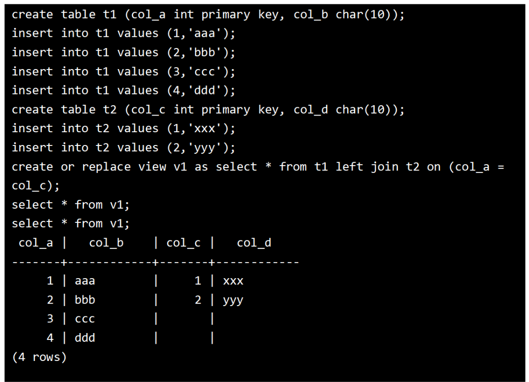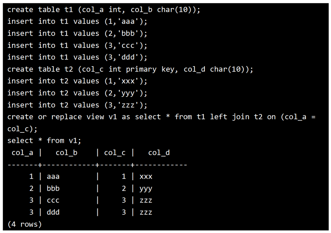 更新的视图列必须是键保留表的相关列,即目标表必须为键保留表,最后的图例中只能更新视图中col_a和col_b两个列,另外两个列col_c和col_d是不能被更新的