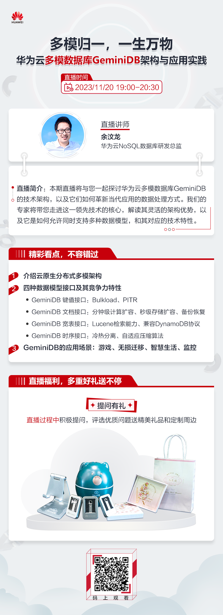 11月20日19:00,华为云NoSQL数据库研发总监余汶龙将带您一起走进GeminiDB,通过线上直播的方式,对GeminiDB进行全方面解读。扫描下方二维码,期待与你共同探索GeminiDB的无限可能!更有直播好礼送不停!