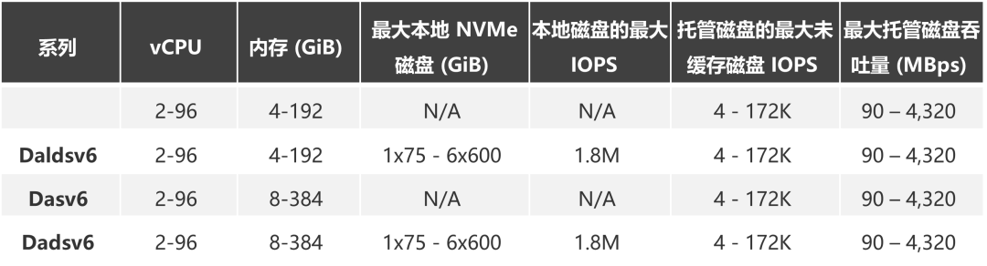 新的 Dasv6 系列虚拟机提供了内存与 vCPU 性能的比例平衡及可扩展性提升,最高可达96个 vCPU 和 384 GiB 的 RAM。而新的 Dalsv6 系列虚拟机则非常适合每个 vCPU 较少 RAM 需求的工作负载,最大可支持 192 GiB 的 RAM。Dalsv6 系列是我们 AMD 系列虚拟机中首次提供的每 2 GiB/vCPU 内存选项。