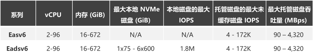 对于需要更多内存的工作负载,新的 Easv6 系列虚拟机提供高内存对虚拟 CPU 的比例包含可扩展性最高至96个 vCPU 和 672 GiB 的 RAM。Easv6 系列虚拟机非常适用于内存密集型企业应用、数据仓库、商业智能、内存分析以及金融交易。