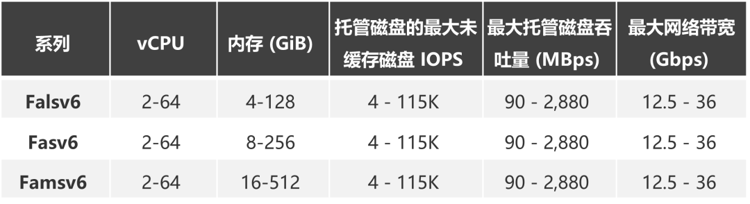 对于计算密集型工作负载,新的 Falsv6、Fasv6 和 Famsv6 虚拟机系列不支持同时多线程(SMT),意味着一个 vCPU 等同于一个完整的核。这些虚拟机最适合对 CPU 性能要求最高的工作负载,如科学模拟、金融建模和风险分析、游戏和视频渲染。