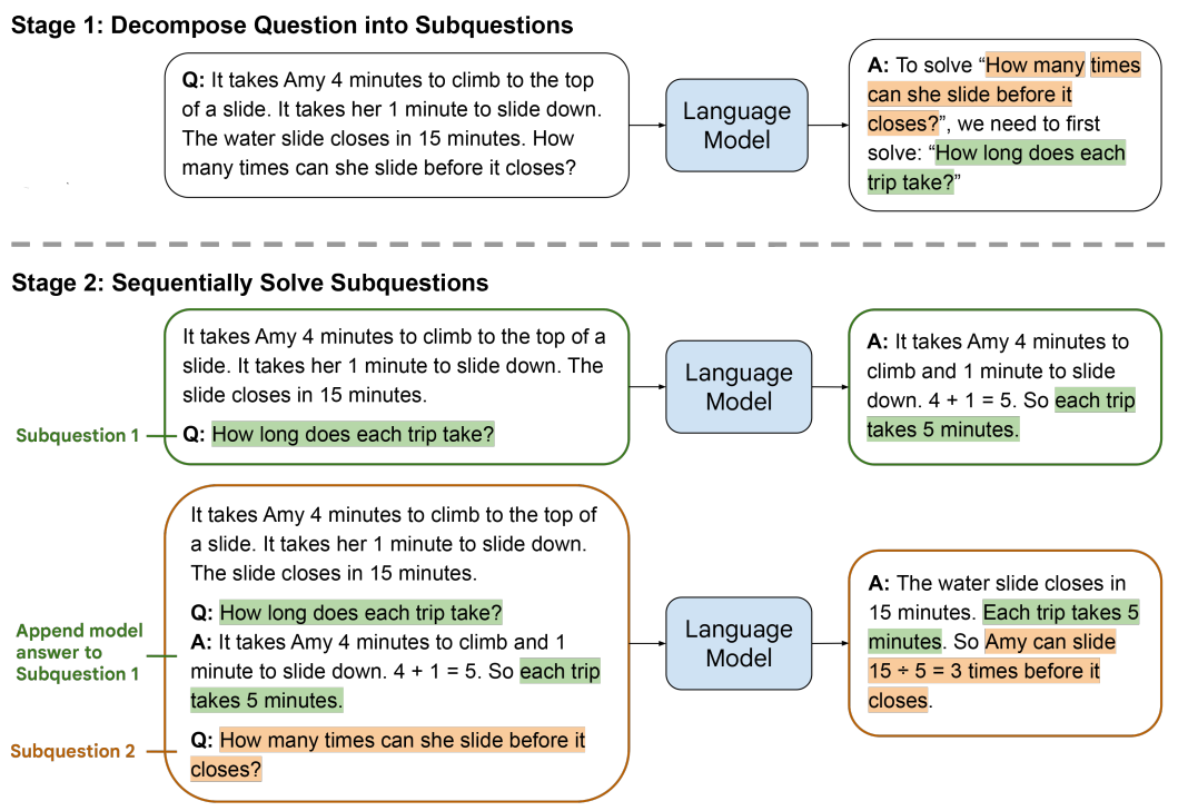 下图给出了Least-to-Most Prompting方法解决一个数学问题的示例: