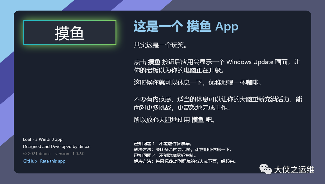 Loaf是一个模拟Windows更新界面的工具,点击后可以模拟正在进行系统升级,从而达到摸鱼的效果。