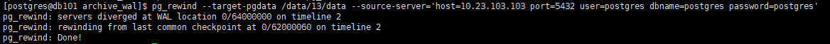 pg_rewind --target-pgdata /data/13/data --source-server='host=10.23.103.101 port=5432 user=postgres dbname=postgres password=postgres'