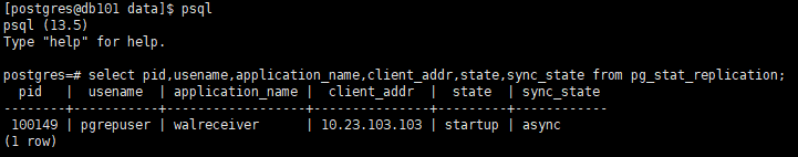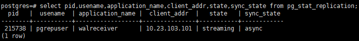 select pid,usename,application_name,client_addr,state,sync_state from pg_stat_replication;