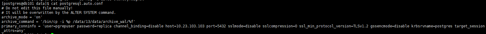 primary_conninfo = 'user=pgrepuser password=replica channel_binding=disable host=10.23.103.103 port=5432 sslmode=disable sslcompression=0 ssl_min_protocol_version=TLSv1.2 gssencmode=disable krbsrvname=postgres target_session_attrs=any'
