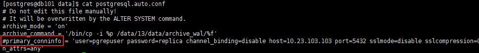 primary_conninfo = 'user=pgrepuser password=replica channel_binding=disable host=10.23.103.101 port=5432 sslmode=disable sslcompression=0 ssl_min_protocol_version=TLSv1.2 gssencmode=disable krbsrvname=postgres target_session_attrs=any'
