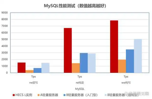 此外,在性能评测上,云耀 L 实例(下图用 HECSL 实例表示)2U4G 对比行内三款云服务器(A 轻量云服务器 2U4G、轻量云服务器(入门型)2U4G、B 轻量云服务器(通用型)2U4G)均取得不错的成绩。MySQL 关系型数据库管理系统测试中,该产品在 rw 读写、ro 纯读和 wo 纯写中均遥遥领先,一般中小型和大型网站的开发上手会更有性价比。
