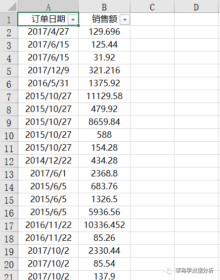 数据源是这样的,就两列,第一列是订单日期,第二列是销售额。
