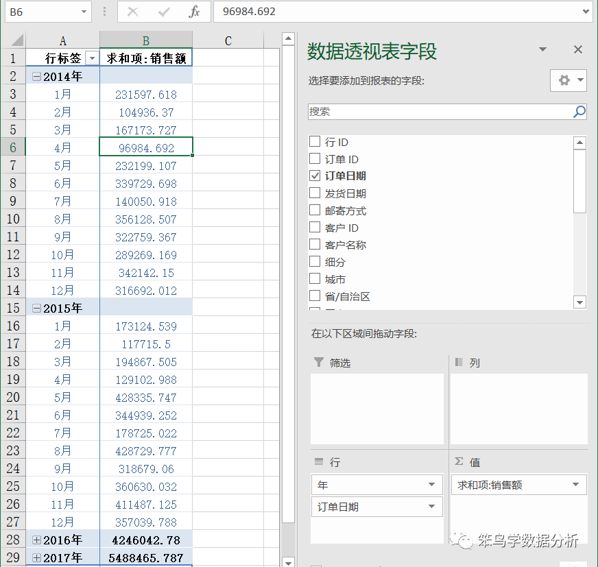 插入数据透视表,求出每年每月的销售额总和,如下图所示。