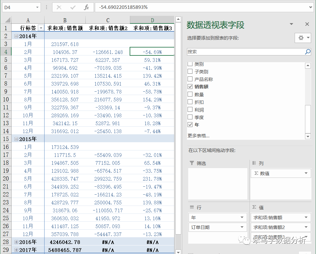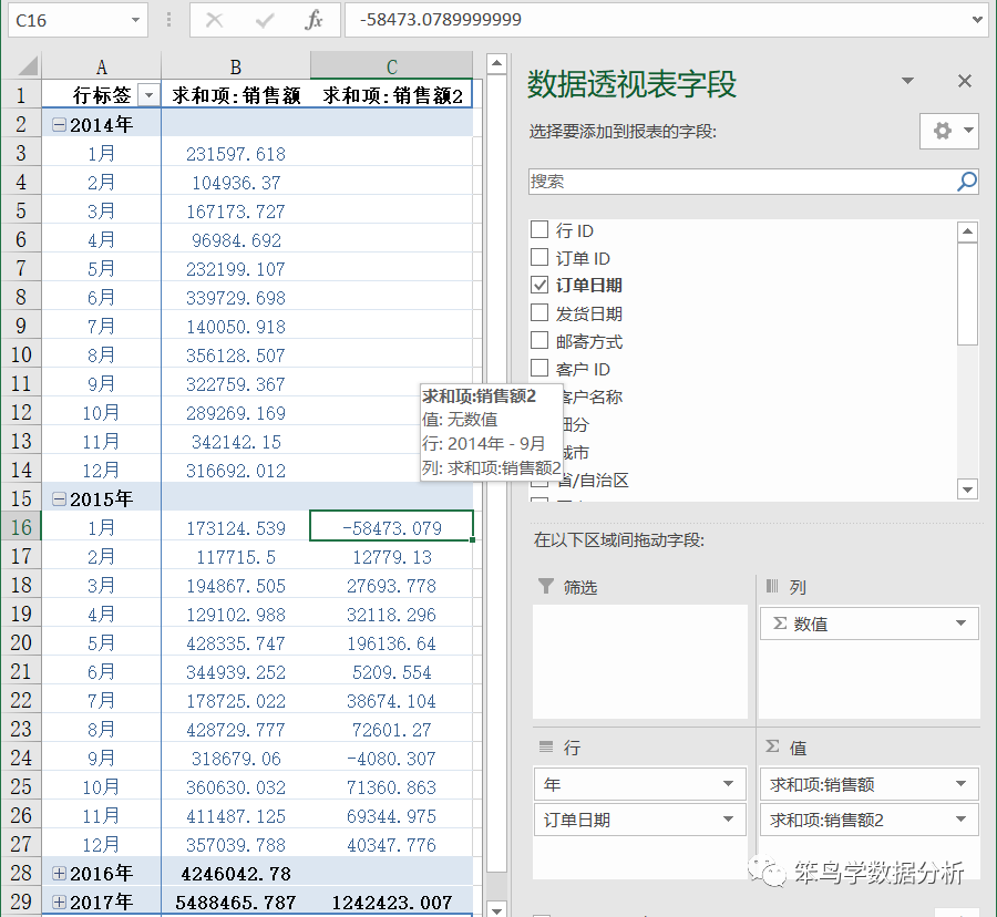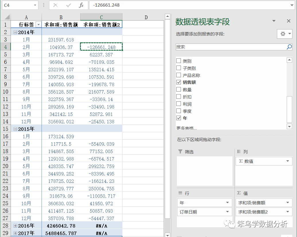 ,比如第一个同比值-58473.079等于2015年1月的销售额减去2014年1月的销售额,如下图所示。
