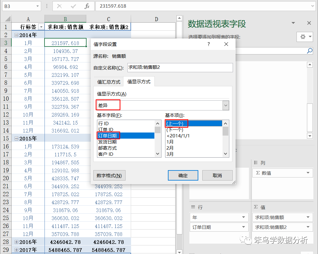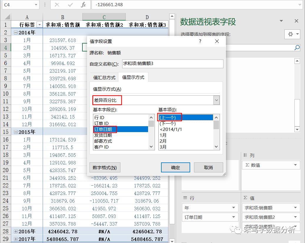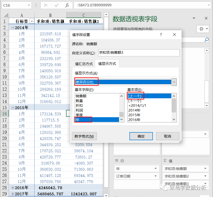 将【销售额】字段再次拖到值区域中,并调整值显示方式,调整方法如下图所示。