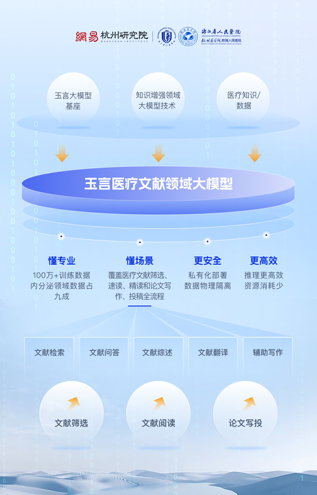 在第九届浙江国际健康产业博览会上,网易杭州研究院与浙江省人民医院联合演示了一个“玉言医疗文献领域大模型”,借助网易玉言大模型基座和知识增强领域大模型技术,解决医疗人员在科研工作中的主要痛点。