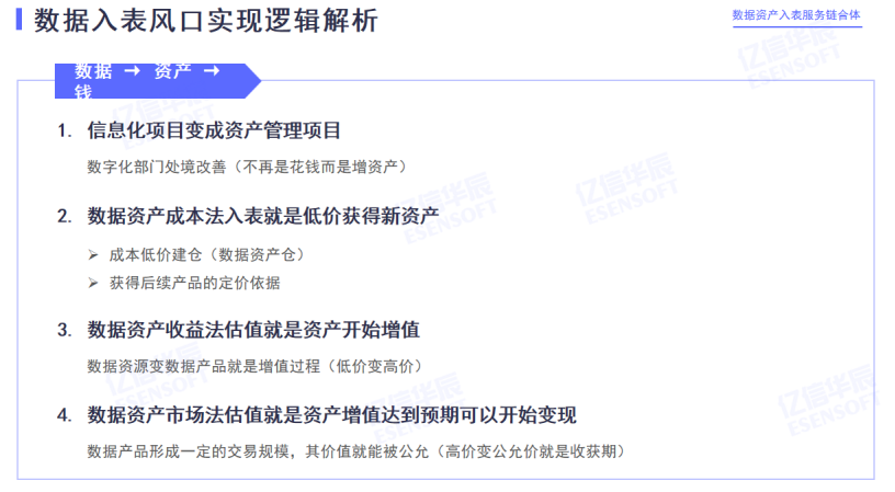先来介绍一下数据入表风口的实现逻辑,即怎样从数据转化为资产变成钱。