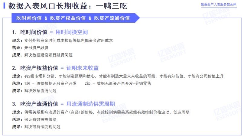 接下来再介绍一下,数据入表风口的长期收益,管它叫做一鸭三吃:一个是吃它的时间价值,另外一个是吃它的资产权益价值,还有一个是吃他的资产流通价值。