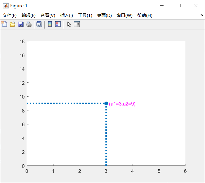 % 定义数对(a1,a2)a1 = 3a2 = 9% 绘制点scatter(a1,a2,60,'filled')% 绘制标注text(a1+0.1,a2,"(a1=3,a2=9)",'color','m')hold on% 绘制直线line([3,3],[0,a2],'linestyle',':','linewidth',3)hold on% 绘制直线line([0,3],[a2,a2],'linestyle',':','linewidth',3)% 设置坐标轴范围xlim([0,6])ylim([0,18])