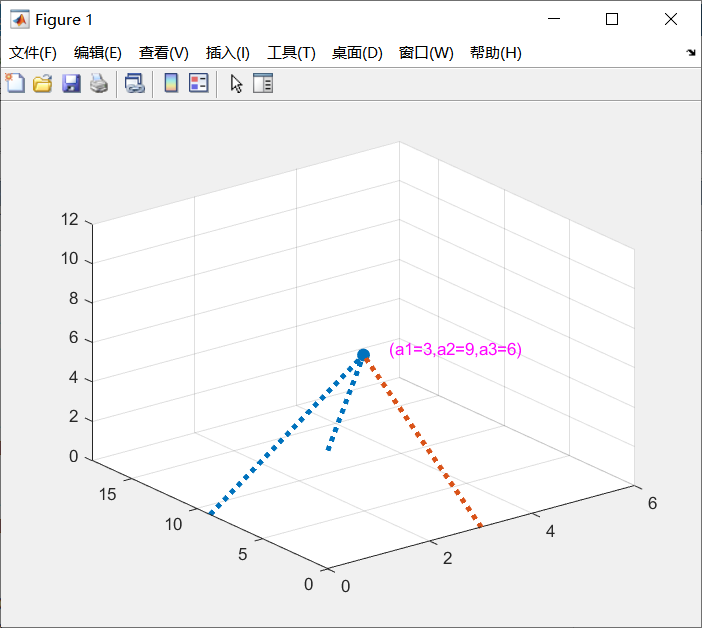 % 定义三元组(a1,a2,a3)a1 = 3a2 = 9a3 = 6% 绘制点scatter3(a1,a2,a3,60,'filled')% 绘制标注text(a1+0.5,a2,a3,"(a1=3,a2=9,a3=6)",'color','m')hold on% 绘制X轴到(a1,a2,a3)的连接线% (3,0,0)(3,9,6)plot3([3,3],[0,9],[0,6],'linestyle',':','linewidth',3)hold on% 绘制Y轴到(a1,a2,a3)的连接线% (0,9,0)(3,9,6)line([0,3],[9,9],[0,6],'linestyle',':','linewidth',3)% 绘制Z轴到(a1,a2,a3)的连接线% (0,0,6)(3,9,6)line([0,3],[0,9],[6,6],'linestyle',':','linewidth',3)% 设置坐标轴范围xlim([0,6])ylim([0,18])zlim([0,12])