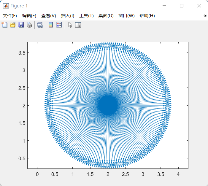 % 设置极径为2r=2;% 在0至2*pi范围内设置极角,极角的间隔为pi/100theta=0:pi/100:2*pi;% 创建长度为numel(theta)的一维数组ox和oy,元素的值为2ox = linspace(2,2,numel(theta));oy = ox% 计算圆周各点的坐标x=r*cos(theta);y=r*sin(theta);% 绘制向量quiver(ox,oy,x,y)axis equal