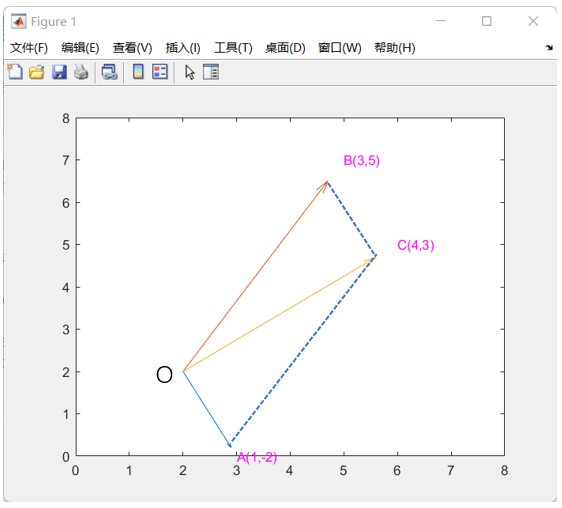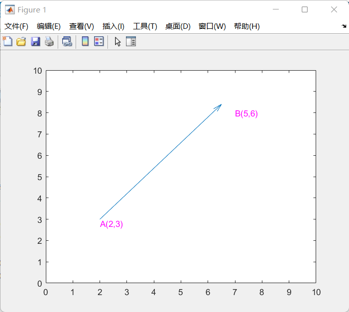 % 定义点AA = [2,3]% 定义点BB = [5,6]% 绘制向量quiver(ox,oy,x,y)quiver(A(1),A(2),B(1),B(2))% 绘制标注text(A(1),A(2)-0.2,"A(2,3)",'color','m')text(B(1)+A(1),B(2)+A(1),"B(5,6)",'color','m')% 设置坐标轴范围xlim([0,10])ylim([0,10]