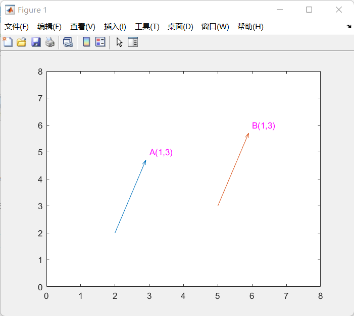 %定义向量AA = [1,3]%定义向量BB = [1,3]quiver(2,2,A(1),A(2))hold onquiver(5,3,B(1),B(2))% 绘制标注text(A(1)+2,A(2)+2,"A(1,3)",'color','m')text(B(1)+5,B(2)+3,"B(1,3)",'color','m')% 设置坐标轴范围xlim([0,8])ylim([0,8])