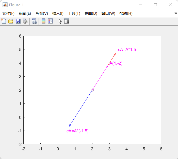 %定义向量AA = [1,2]%向量A乘以实数1.5cA = A*1.5cB = A*(-1.5)%绘制向量hold onquiver(2,2,cA(1),cA(2),'color','r')quiver(2,2,cB(1),cB(2),'color','b')quiver(2,2,A(1),A(2),'color','m')%绘制向量起点scatter(2,2)% 绘制标注text(A(1)+2,A(2)+2,"A(1,-2)",'color','m')text(cA(1)+2,cA(2)+2,"cA=A*1.5",'color','m')text(cB(1)+2,cB(2)+2,"cA=A*(-1.5)",'color','m')% 设置坐标轴范围xlim([-2,6])ylim([-2,6])纯量乘法满足结合律和分配率。c(dA)=(cd)A(c+d)A=cA+dA