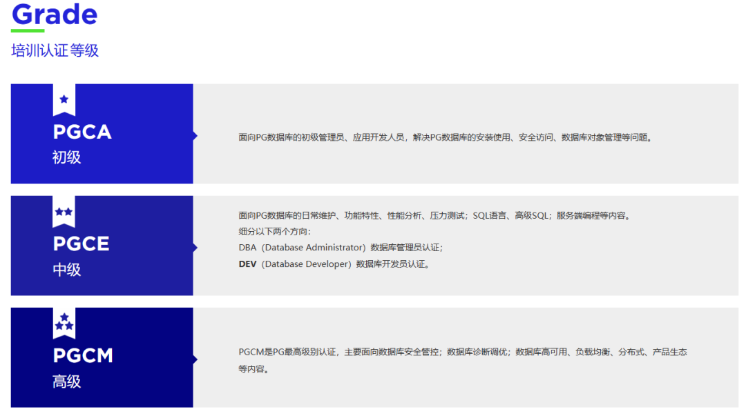 与ORACLE的认证差不多,PG的认证一般也分为3个等级,以第1家为例,共分为PGCA、PGCE、PGCM三级级别。
