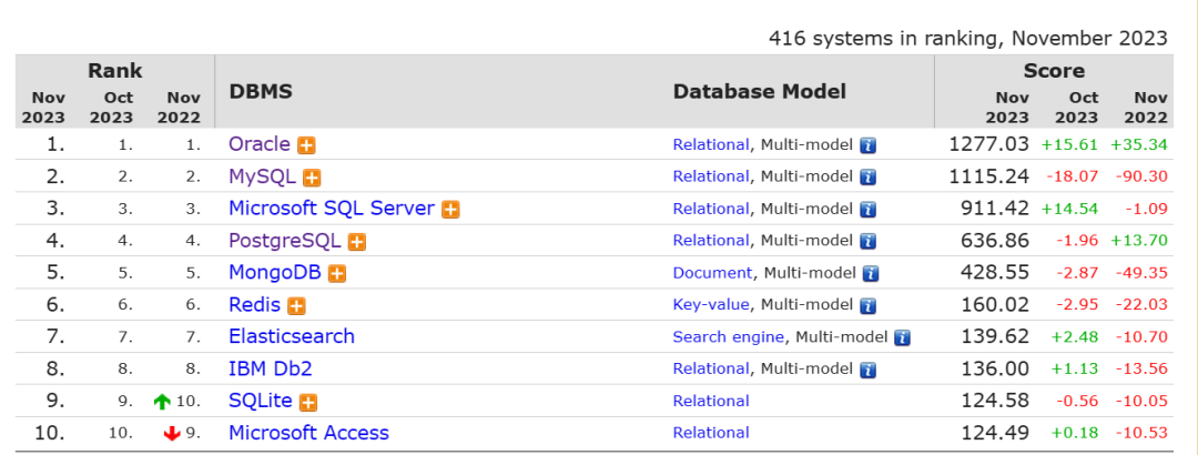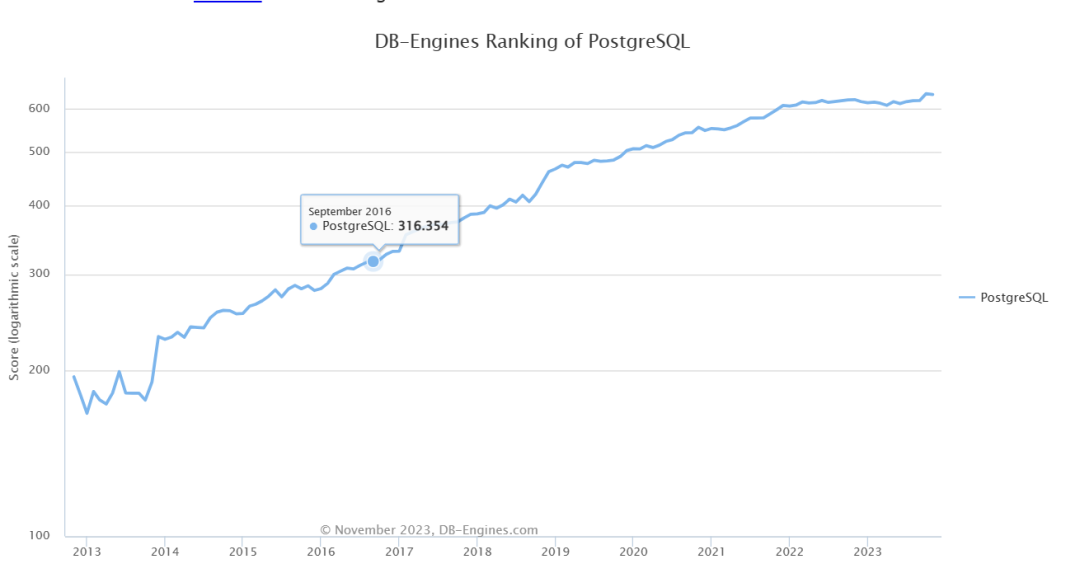 截止至2023年11月,DB-engines排名,PostgreSQL仍在第4位。