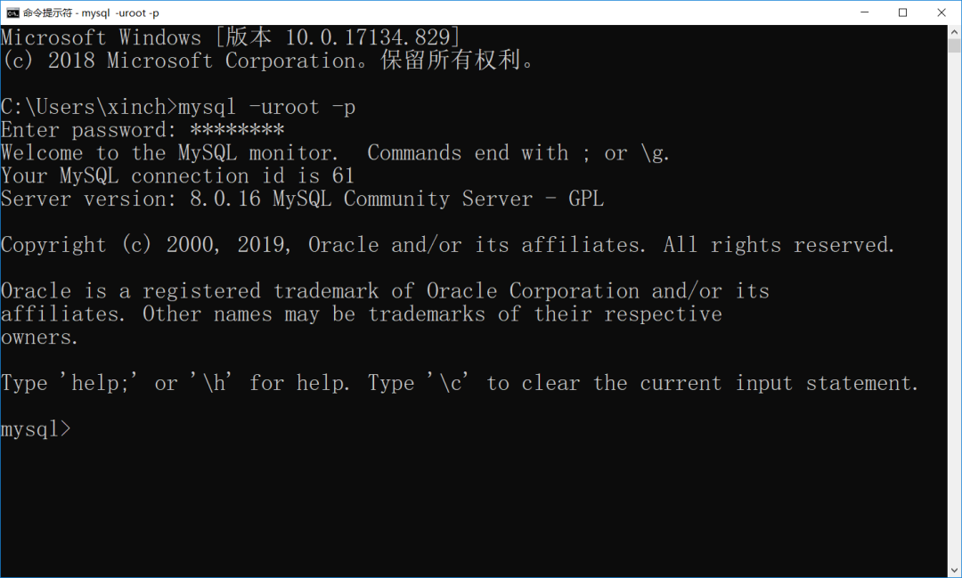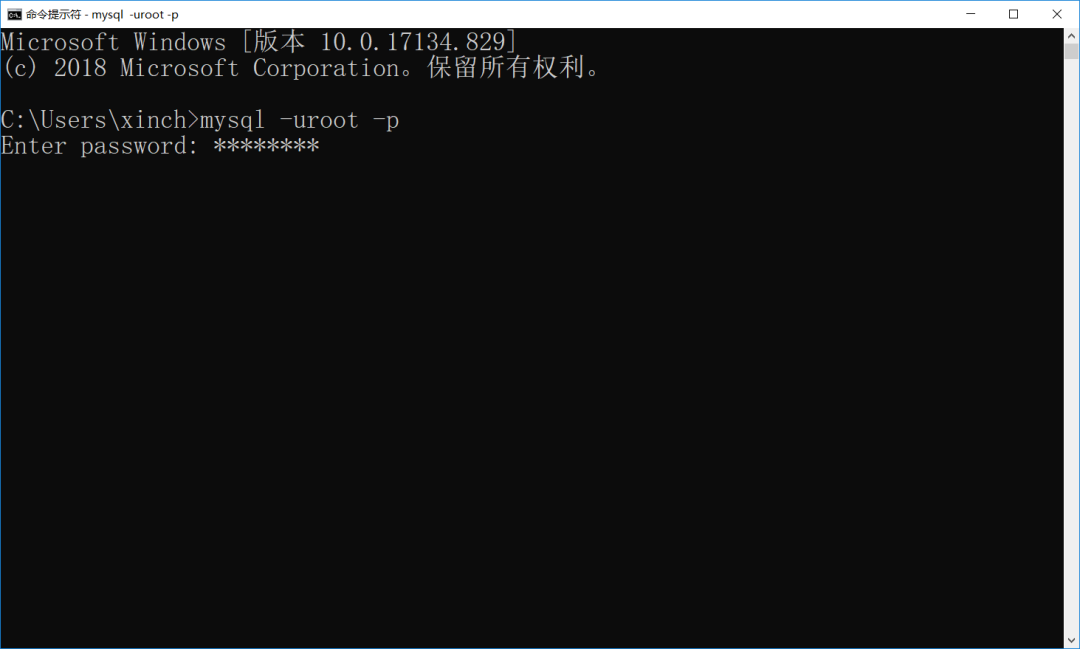 -uroot表示以root账号登录MySQL,-p表示以密码方式登录。在登录过程中会要求你输入密码,root账号的密码就是在安装MySQL过程中,要求输入的root账号的密码。