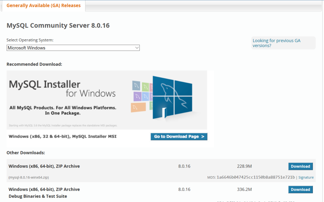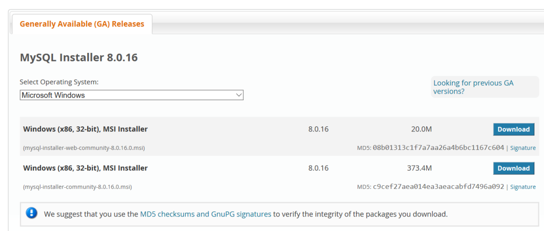 (3)在MySQL Community Server 8.0.16下载页面中,单击MySQL Install for Windows图形区域,进入Download MySQL Installer页面,如图4-3所示。