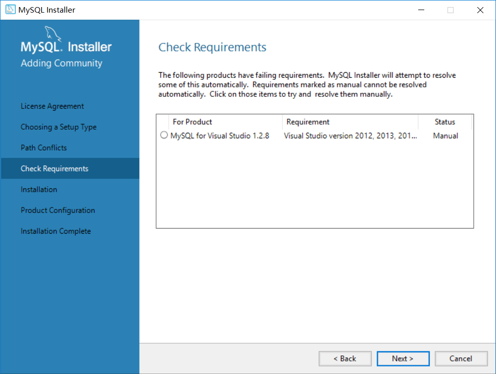 (4)MySQL安装程序会检测软件环境是否满足安装需求,如果出现图4-8所示的页面,可能需要先安装缺失软件。图4-8提示缺失MySQL for Visual Studio 1.2.8软件,可以忽略提示的缺失软件,直接单击Next按钮即可。