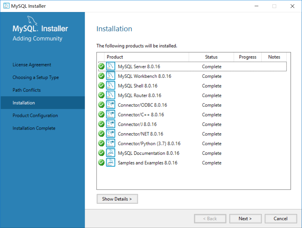(6)安装完成后,出现如图4-10所示的页面,该页面表示MySQL8.0.16安装已完成,单击Next按钮,进入配置页面。