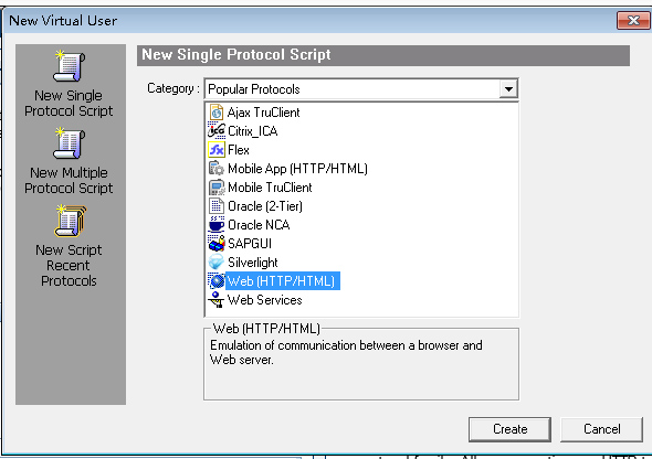 单击上图的“新建脚本”图标,loadruner弹出协议对话框,选择WEB[HTPP/HTML]协议,用于WEB测试。