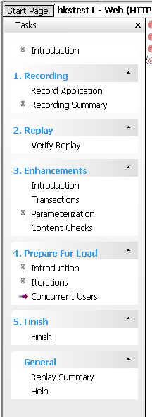在Tasks窗口列表,单击【Concurrent Users】命令,脚本操作窗口的右侧窗口会显示并发用户相关内容。